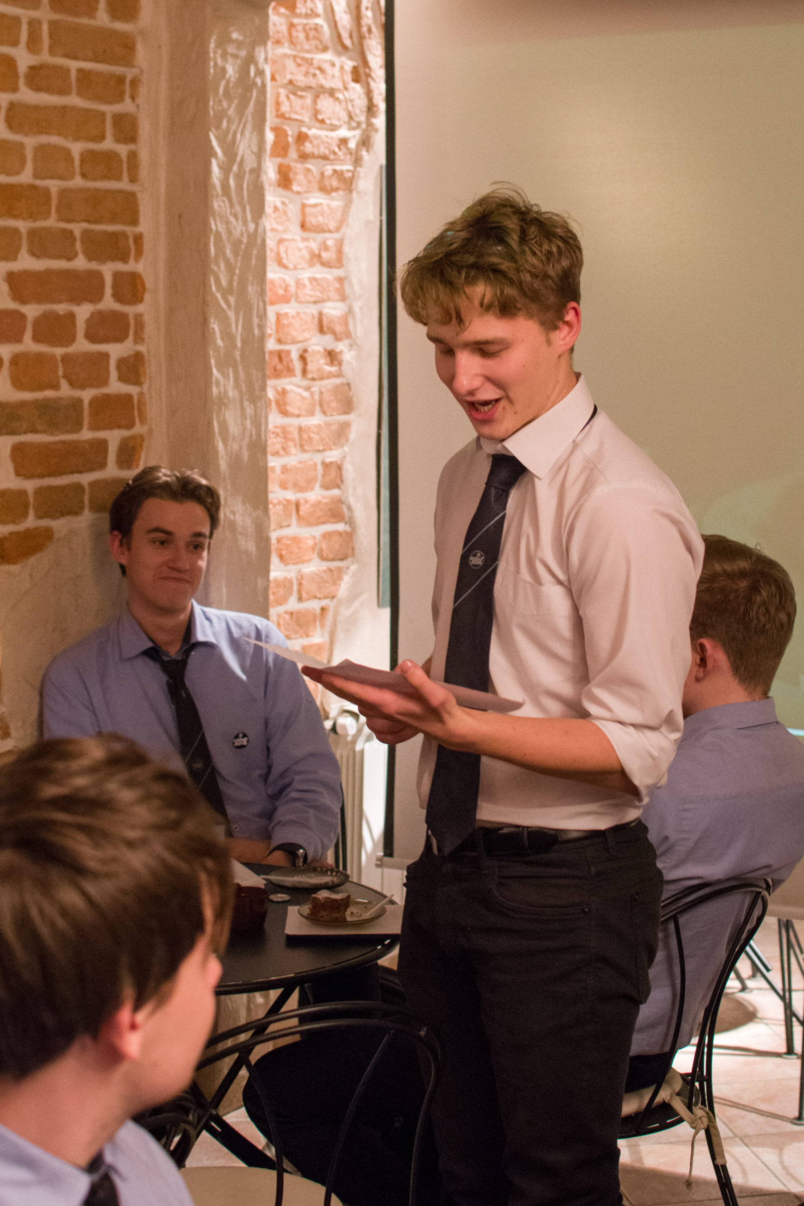 We wtorek 30 listopada 2021 roku odbył się u nas w szkole ,,Podwieczorek z Różewiczem”. Był on związany z dobiegającym już końca rokiem Różewicza, który nosi taką nazwę z powodu 100. rocznicy urodzin poety. Podwieczorek miał miejsce w piwnicy artystycznej i został zorganizowany przez uczniów klasy 4c wraz z Panią Profesor Katarzyną Lancmańską. W tym wydarzeniu brali udział znakomici goście: Pan Dyrektor Ryszard Pyssa, Pani Profesor Ewa Tarabasz oraz Pani Profesor Alicja Gizelska. Podczas podwieczorku, przy kawie, herbacie i cieście, zostały przedstawione wyniki konkursu, którego tematem było napisanie tekstu literackiego, zaczynającego się słowami ,,Mam dziewiętnaście lat…”. Miał on nawiązywać do wiersza Tadeusza Różewicza ,,Ocalony”.
