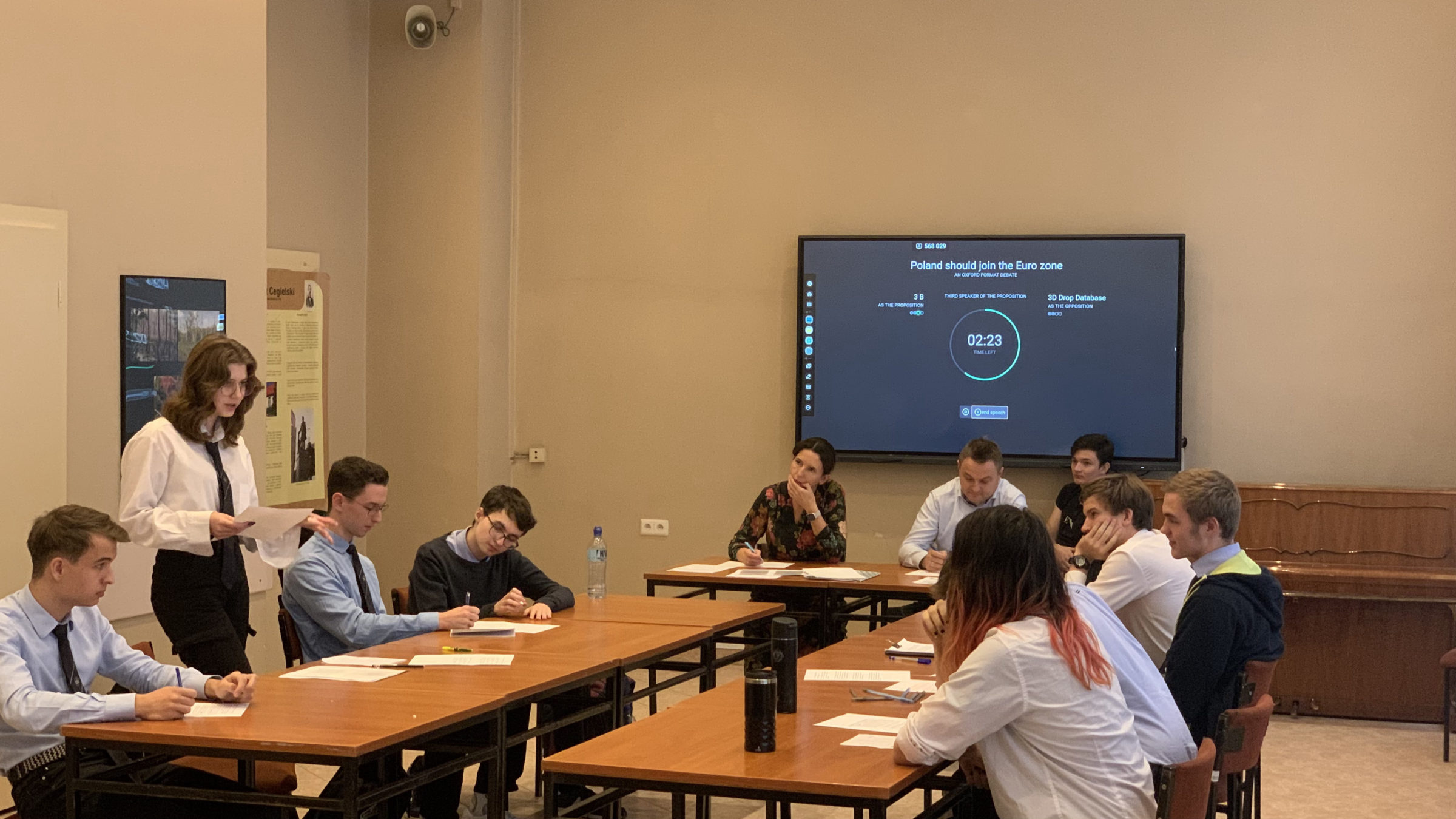 W rywalizacji tego dnia wzięły udział 4-osobowe drużyny z czterech klas dwujęzycznych. Najpierw 3B gr. A1, która była tzw. „proposition”, zmierzyła się z klasą 3D gr. 2/2 tzw. „opposition” w debacie o wprowadzeniu Euro w Polsce. W tym starciu „o włos” wygrała drużyna z klasy 3B.