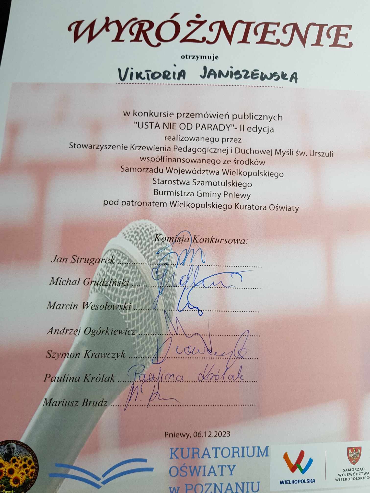 W werdykcie Wojewódzkiego Konkursu Krasomówczego „Usta nie od parady” jury w Pniewach wyróżniło trzech uczniów z naszej szkoły. Celem konkursu przemówień publicznych było wyłonienie najlepszych mówców, którzy wyrażą siebie poprzez różnorodne formy i środki retoryczne z wykorzystaniem wrodzonych zdolności.