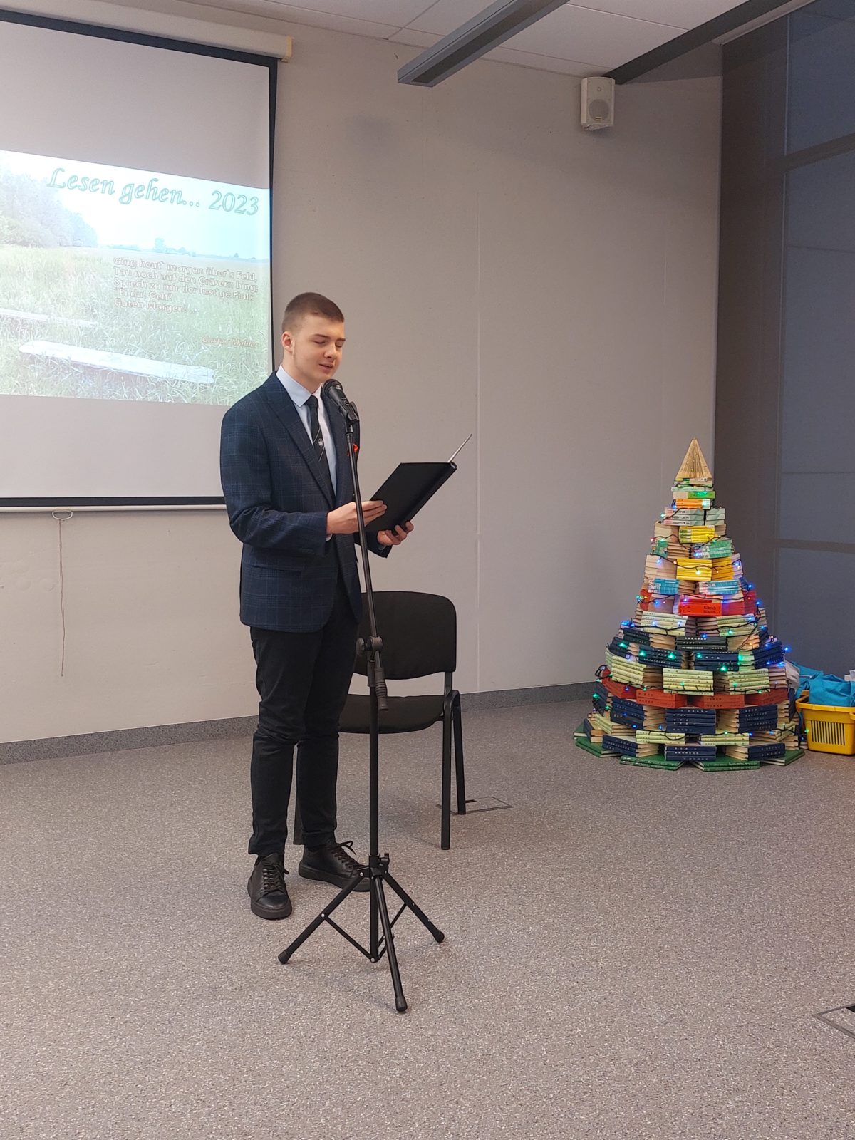Nasz uczeń otrzymał także nagrodę specjalną Fundacji Literackiej ,,Jak podanie ręki ‘’za interpretację wiersza ,,Das Lied von der Moldau’’.