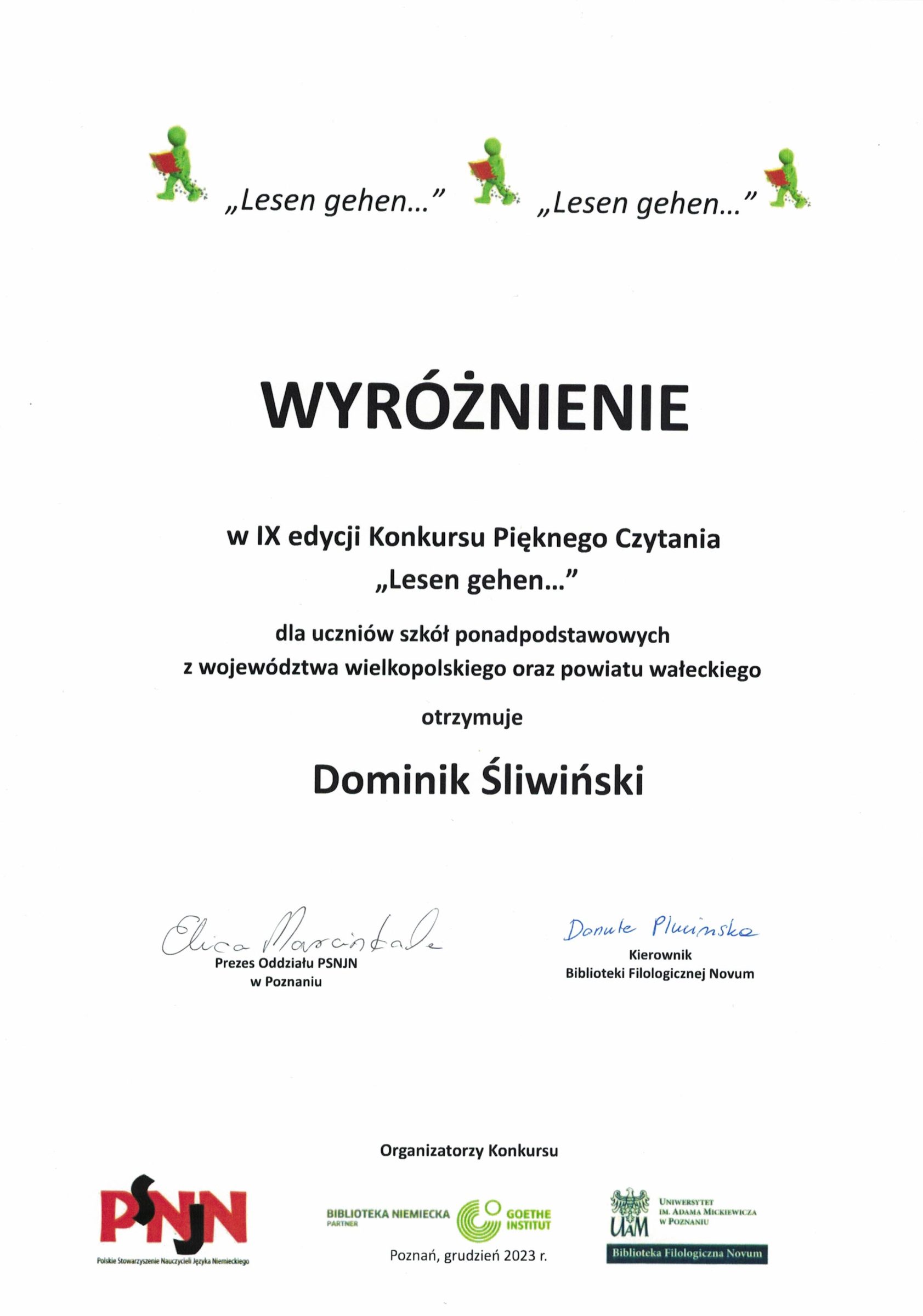 Z radością i dumą informujemy o sukcesie ucznia naszej szkoły, Dominika Śliwińskiego z klasy 1A, który został wyróżniony w konkursie pięknego czytania poezji niemieckojęzycznej ,,Lesen gehen’’, organizowanego przez Polskie Stowarzyszenie Nauczycieli Języka Niemieckiego.
