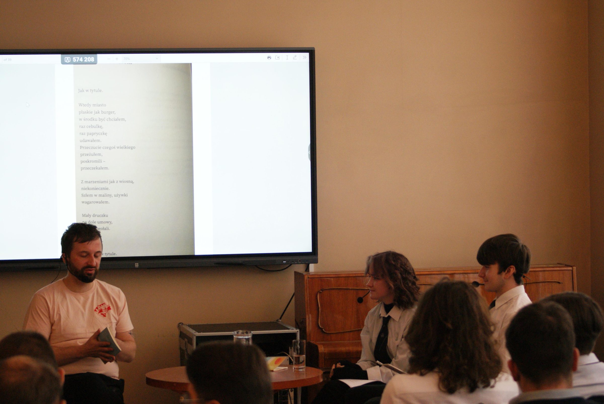 Podczas spotkania, które moderowane było przez Victorię Janiszewską z klasy 3B i Filipa Buszewicza z klasy 3B, Ivan Davydenko czytał fragmenty swoich wierszy, dotykając tematów tożsamości, religii, kultury, miłości i śmierci. Uczniowie aktywnie uczestniczyli, zadając autorowi wiele pytań dotyczących jego życia, twórczości i osobistych przekonań.