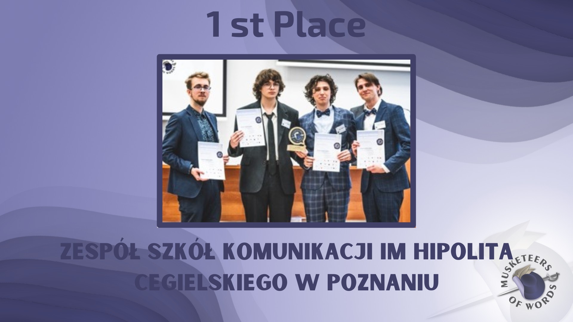 Czterech mówców z dwujęzycznej klasy 5C w składzie: Jakub Mańczak (1. mówca), Sebastian Siejek (2. mówca), Kacper Włosiński (3. mówca) i Aleksander Skubała (4. mówca) reprezentowało naszą szkołę na IX Mistrzostwach Polski Debat Oksfordzkich w Języku Angielskim „Muszkieterowie Słowa” (ang. „Musketeers of Words”). Turniej odbył się w dniach 22-23 marca 2024 w Bydgoszczy.