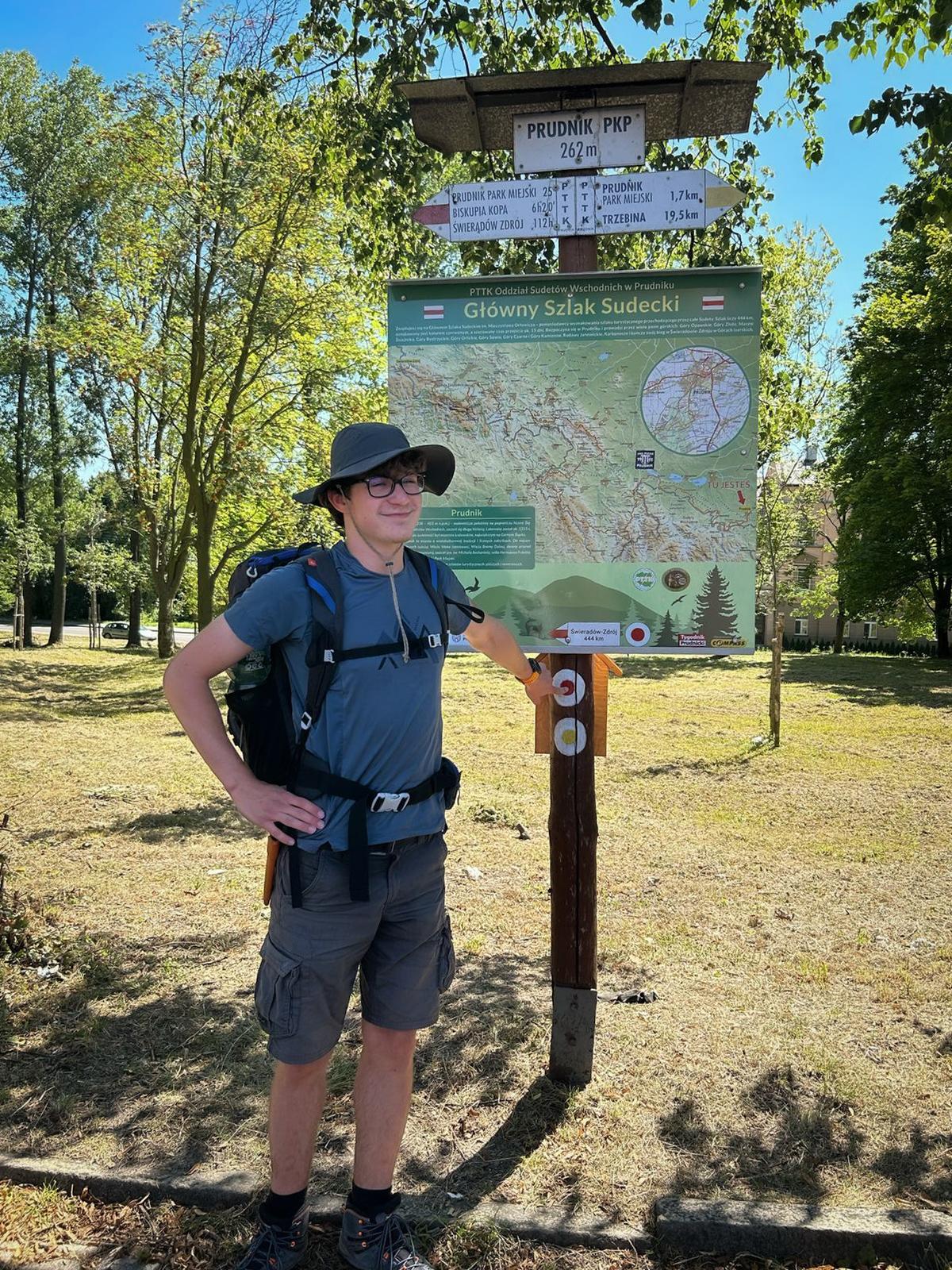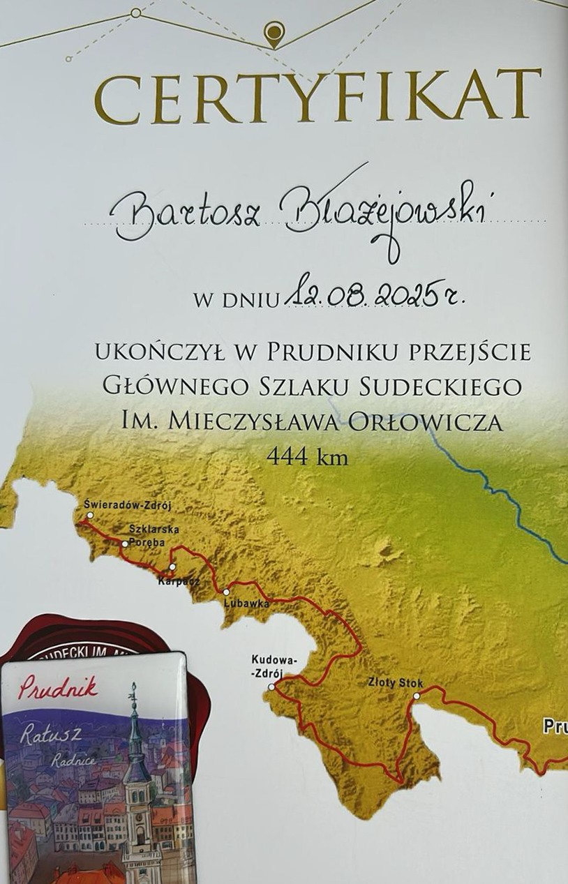 12 sierpnia 2025 r. Bartek Błażejewski, uczeń klasy 3e o profilu technik automatyk, od września uczeń klasy 4e, zakończył swoją niezwykłą wędrówkę w Prudniku, pokonując samodzielnie legendarny Główny Szlak Sudecki im. Mieczysława Orłowicza. W ciągu zaledwie dwóch tygodni przeszedł aż 444 kilometry, mierząc się z różnorodną pogodą, wymagającym terenem i codziennymi wyzwaniami w drodze.
