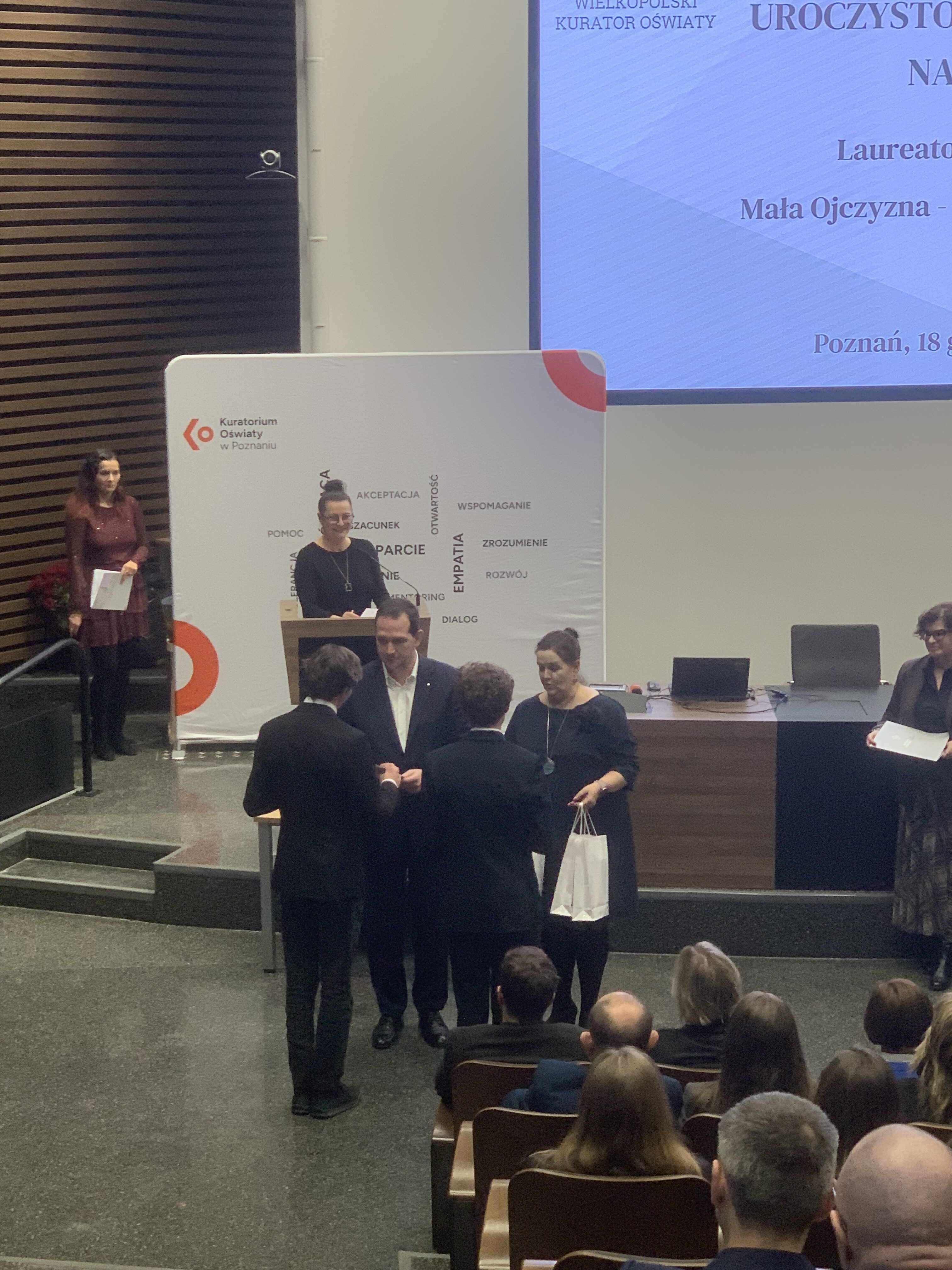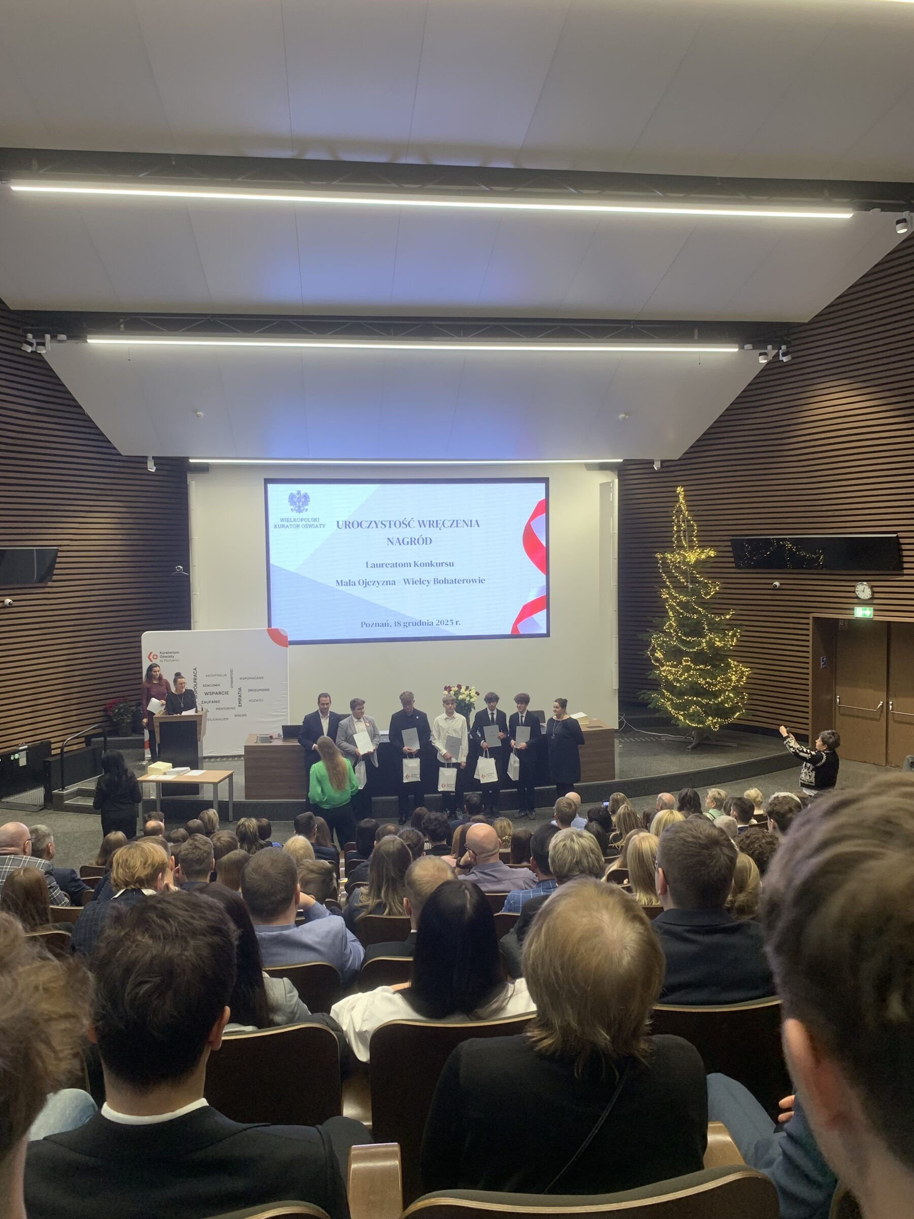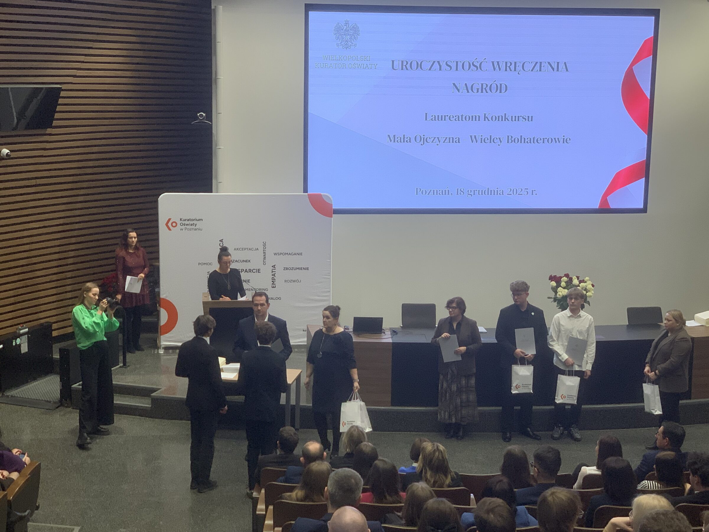 18.12.2025r. odbyła się gala finałowa konkursu Wielkopolskiego Kuratora Oświaty „Mała ojczyzna – wielcy bohaterowie”. Jego celem było budowanie lokalnego patriotyzmu, odkrywanie i promowanie lokalnych bohaterów oraz ich zasług dla społeczności oraz integracja społeczności szkolnych i lokalnych wokół historii regionu.