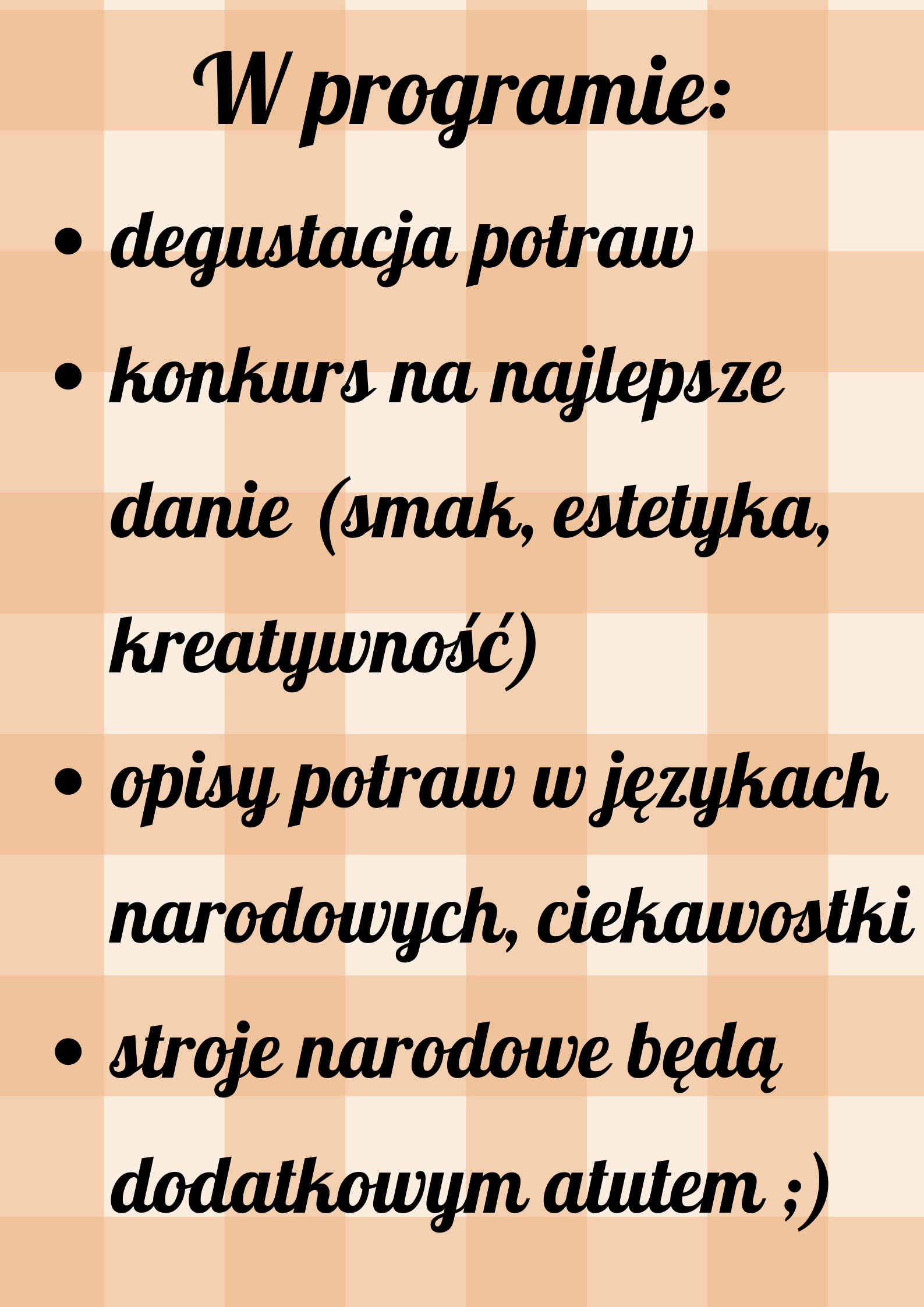 Przynosicie potrawę, przekąskę lub deser z wybranego kraju — może to być Wasze ulubione danie, albo coś, co zawsze chcieliście wypróbować. Przygotujcie opis potrawy w języku kraju, z którego pochodzi potrawa. Przebierzcie się w charakterystyczne stroje, przygotujcie stoisko narodowe. Wszystko to będzie dodatkowym atutem:) Przewidziane nagrody 😉